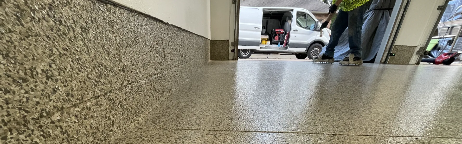 Flake and metallic finishes are applied carefully for consistent coverage, traction, and visual balance.